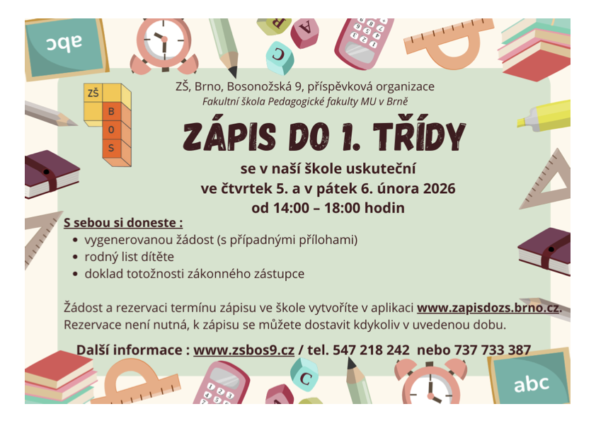 Zápis dětí do 1. tříd proběhne ve čtvrtek 5. února 2026 a v pátek 6. února 2026 vždy od 14 do 18 hodin.