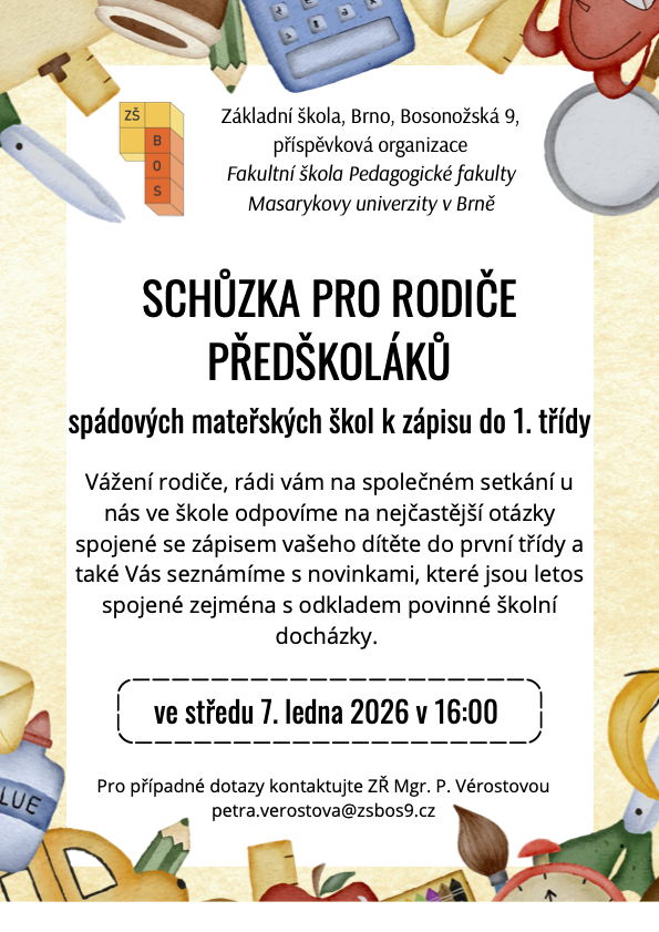 Schůzka pro rodiče předškoláků Ve středu 7. ledna 2026 se uskuteční ve škole informační schůzka pro rodiče předškoláků. Fotogalerie