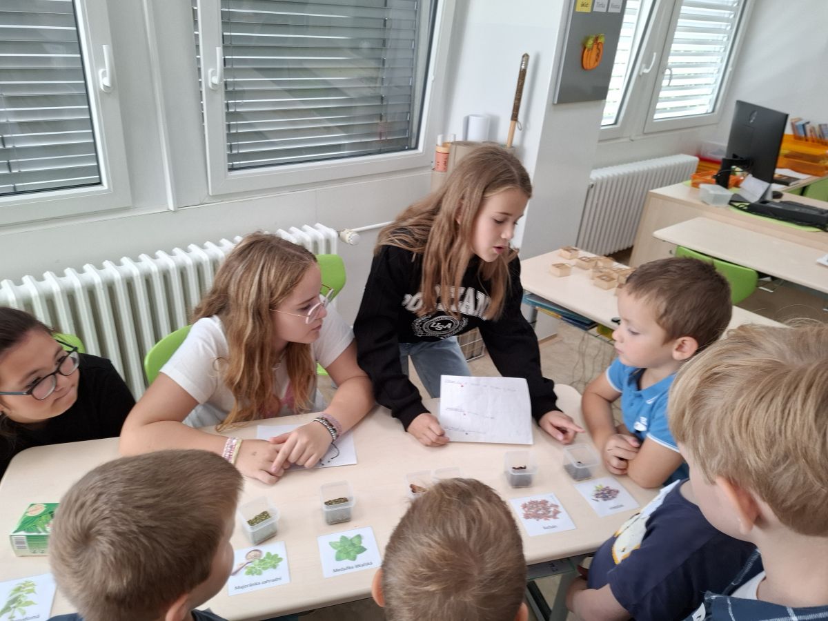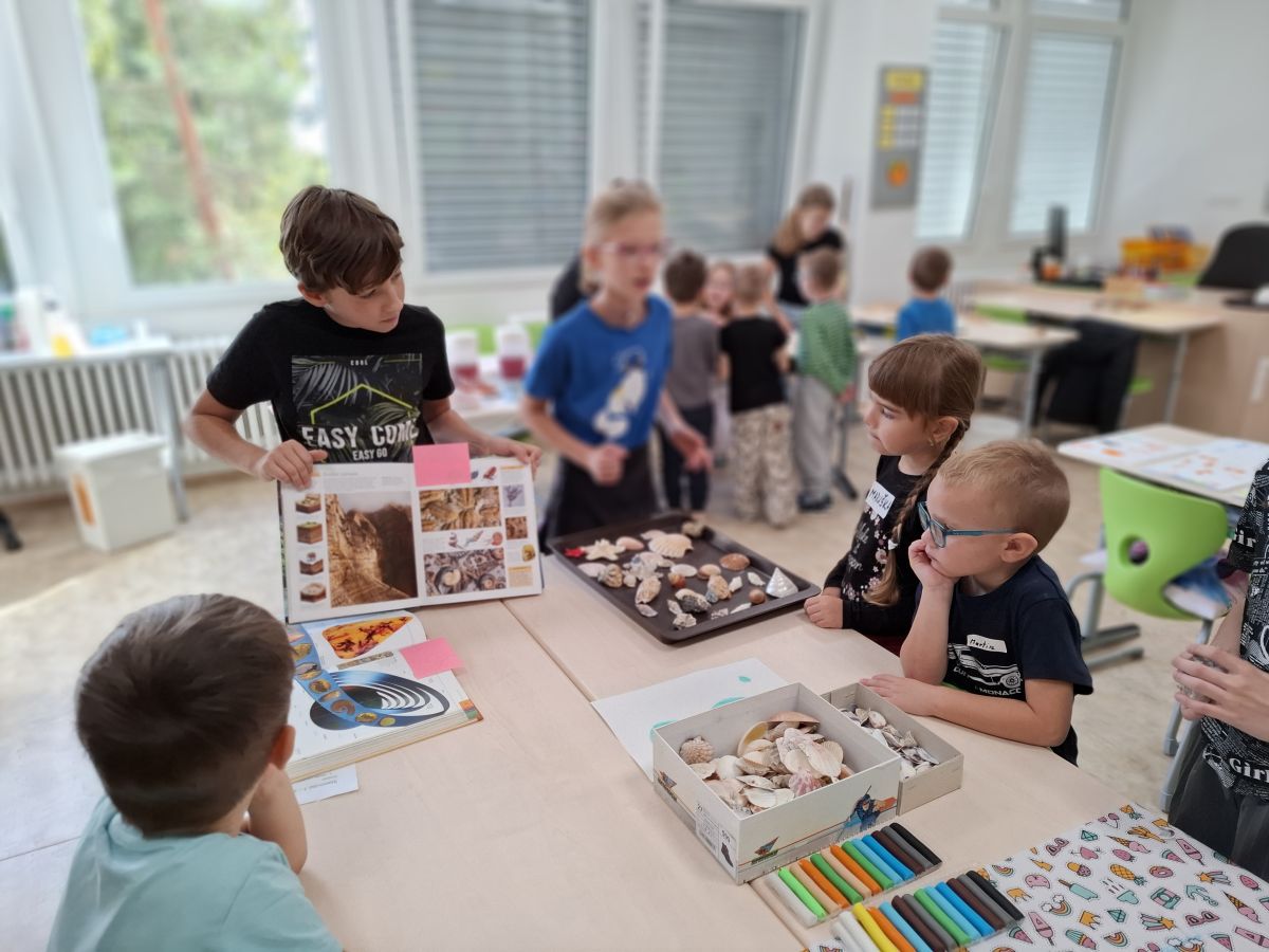 Předškoláci z MŠ Bosonožská a MŠ Kosmonautů strávili dopoledne aktivně bádáním a pozorováním u nás ve škole, které si pro ně připravili žáci 5. ročníků. V rámci projektu „Na skok do školy“ a programem Badatelství se měli možnost seznámit např. s blahodárnými účinky bylin a koření a jejich rozpoznávání zrakem nebo čichem. Velmi oblíbenou částí byla ochutnávka 4 druhů čajů a ovoce – čerstvého i sušeného. Dále vytvářeli mícháním základních barev barvy jiné, poprvé asi někteří zaslechli slovo „barevné spektrum“, barvy teplé a studené. Měli možnost se podívat na zkaměneliny, dozvědět se něco o jejich vzniku a nakonec si sami takové otisky rostlin a živočichů udělat – otiskem do plastelíny a odnést na památku do školky.